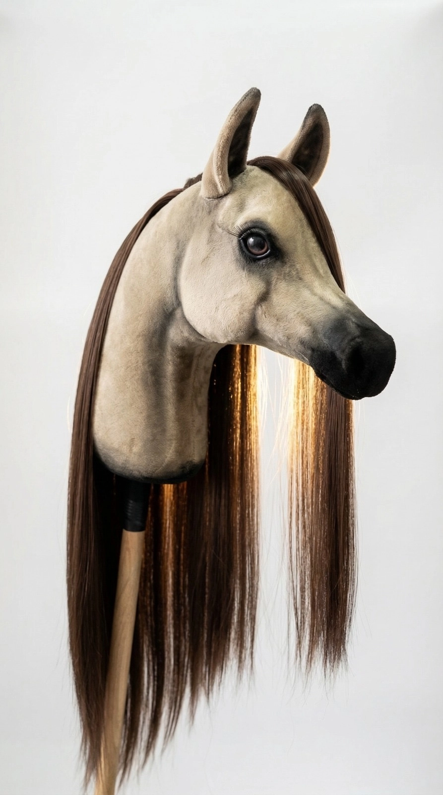 The horse head model is made from durable polyurethane foam, covered with soft minky fabric. The delicate sheen of the material perfectly mimics the texture and appearance of real horsehair.